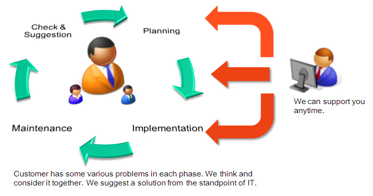 With customer's system person's in charge situation, a user's skill level, etc., we examine how much support is required, and propose.