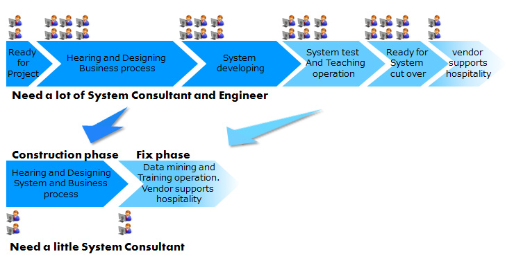 For example, in ERP package implementation, we choose the optimal system that suited the requirements for a customer. And we do base customization, and are striving to get a customer to use it immediately.
